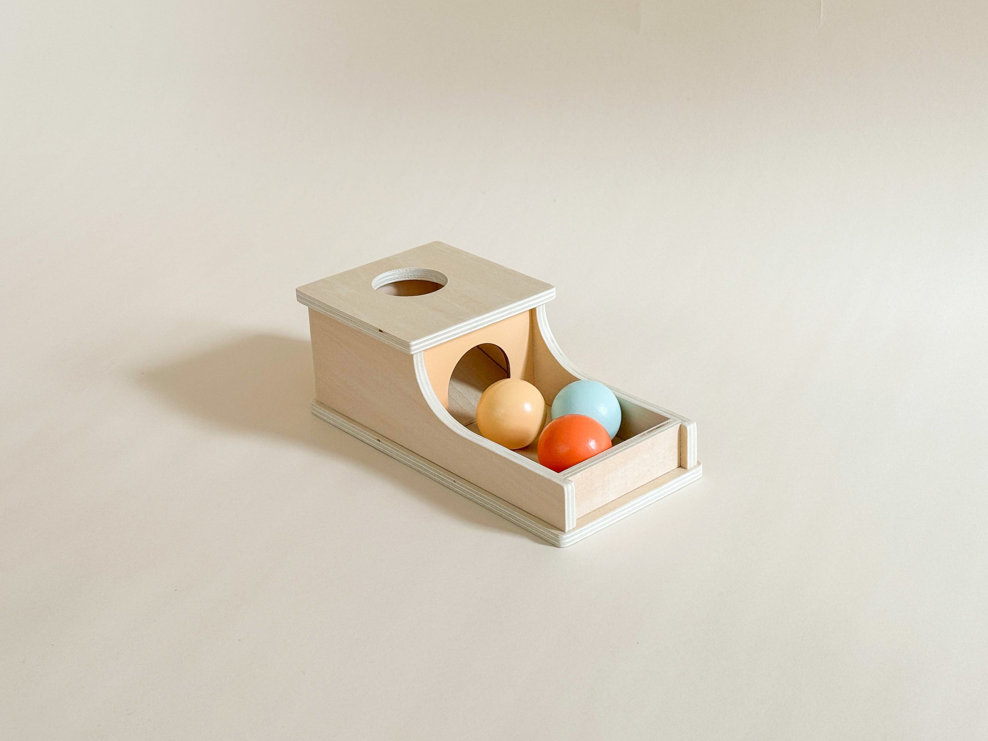 The "now you see it" box. By dropping the ball and watching it reappear, your baby learns that things exist even when out of sight while refining their hand-eye coordination.